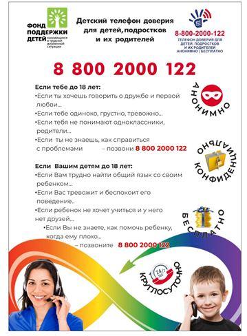 В любой момент нашей жизни может потребоваться психологическая помощь. Дети и их родители могут позвонить на бесплатный круглосуточный телефон доверия 8-800-2000-122 или 124. По этому телефону можно получить консультацию, совет как поступить в той или иной ситуации при возникающем конфликте в семье, между сверстниками, проблеме родителей и детей. На звонки отвечают опытные психологи, прошедшие специализированное обучение.