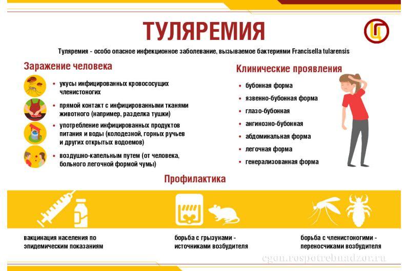 Туляремия очень заразна: восприимчивость людей к ней составляет почти 100%. В этой связи туляремию иногда называют “малой чумой” и относят к особо опасным инфекциям.